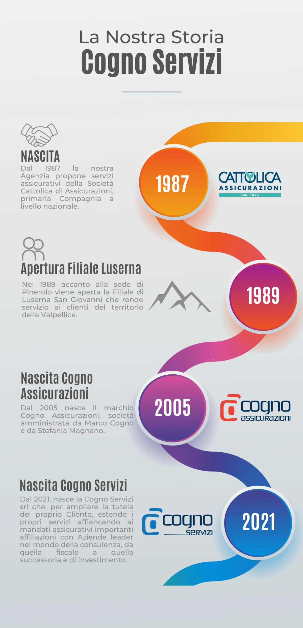 La nostra realtà nasce nel 1987 grazie alla passione e professionalità di Marco Cogno che, dopo alcuni anni di esperienza nel settore assicurativo, decide di legarsi al marchio della Società Cattolica di Assicurazione.